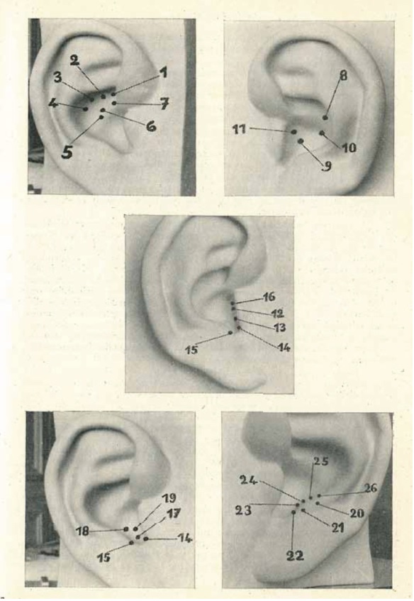 Jusqu’en 1968, il s’agissait d’étudier les correspondances périphérie-auricule tout en stimulant la périphérie par des procédés physiques nociceptifs : chaud, froid, pincement, etc. Cela permettait d’étudier alors sur l’oreille les modifications de la sensibilité des points ou leur changement de résistance électrique.